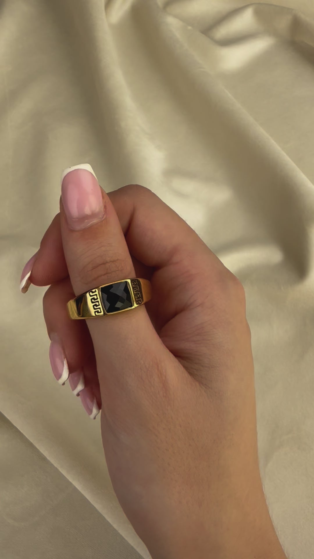 Unazë gold me gur të zi elegant – kombinim perfekt i luksit dhe stilit modern. Ideale për një pamje të fuqishme dhe të rafinuar